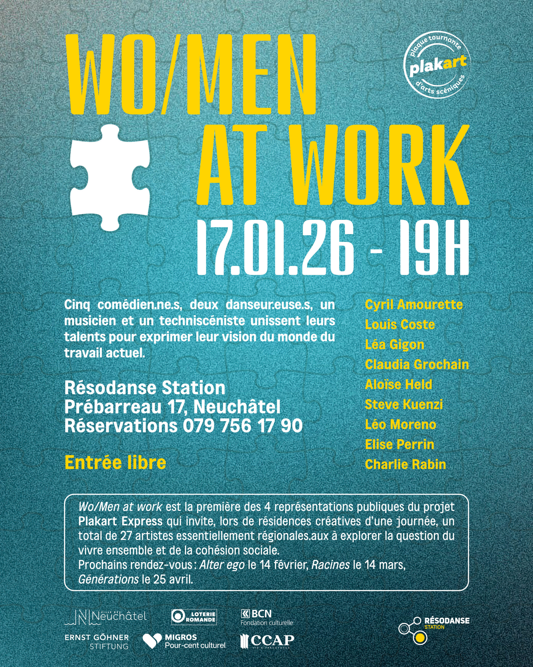 Pour 2026, dans le cadre d’une volonté de sens, d’engagement et de valorisation de la richesse artistique du canton, nous avons conçu le projet PLAKART EXPRESS, qui aborde le vivre-ensemble et la cohésion sociale à travers 4 représentations thématiques, fruits de résidences interdisciplinaires réunissant à chaque fois à Résodanse Station 9 artistes d’horizons différents sur une journée :